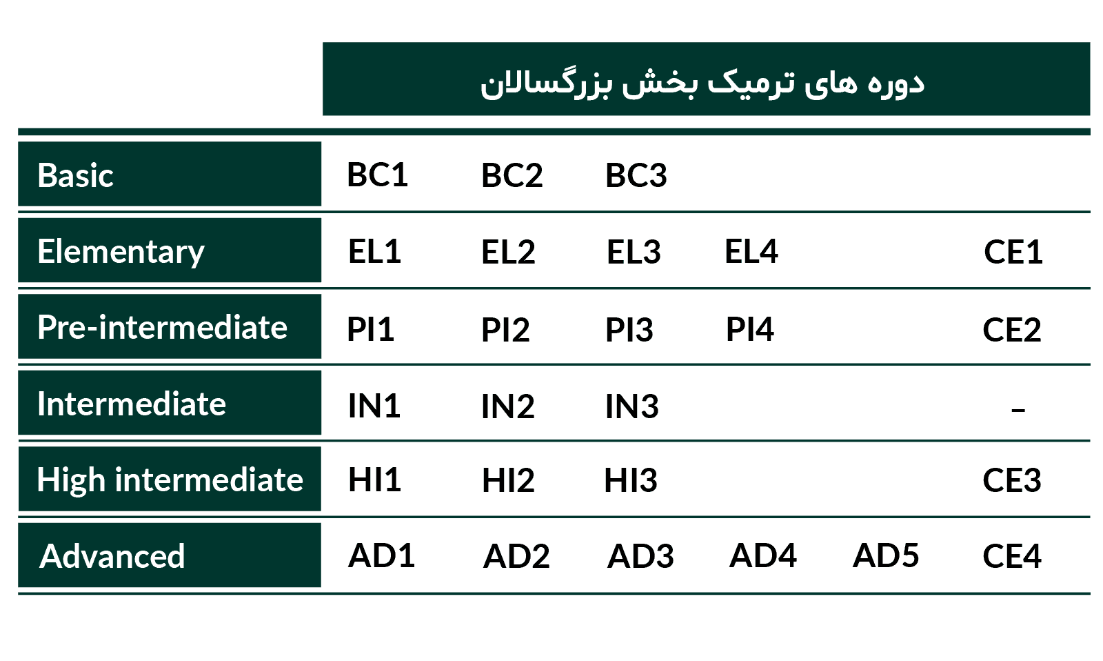 این دورهها برای اشخاصی مناسب است که انگیزه کافی و نیاز مبرم به یادگیری زبان انگلیسی داشته و طبعاً مناسب اشخاص تحصیلکرده و بالای ۲۰ سال میباشد. کلاسهای فشرده در دو دوره Elementary و Pre-intermediate تشکیل میگردند. هر دوره شامل ۵ ترم میباشد.